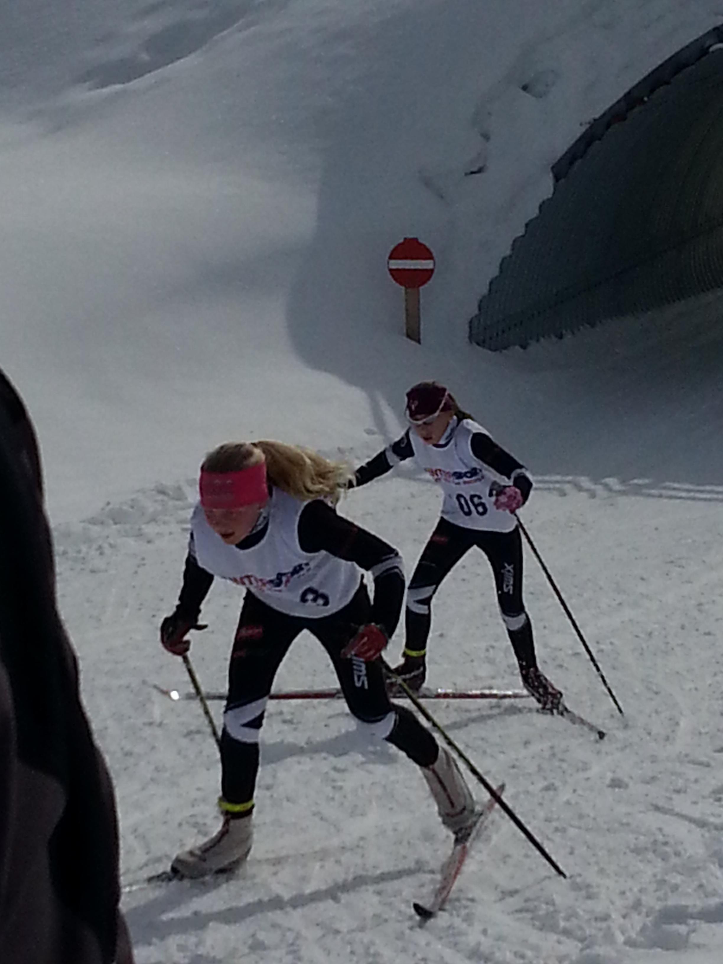 Victoria med Maja i rygg i siste motbakke ca. 350 m fra mål