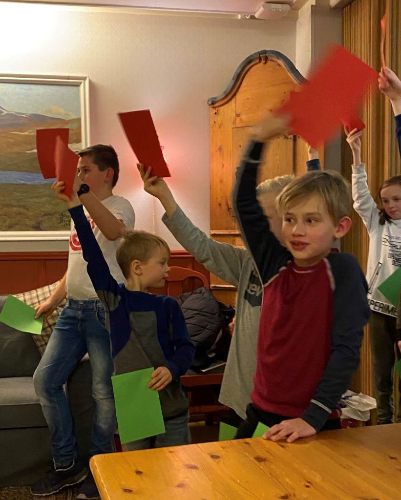 Etter middag på lørdagen fikk vi også lekt litt i fjellstua med quiz laget av våre eldste 03-gutter, og med påfølgende stafett med Marie kjeks og bamsemums-spising, få 3 seksere på rad og miming. Stor stemning, og fine premier fra blant annet Energihuset.